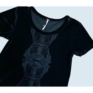 Very cool Free People top. Black velvet baby doll t shirt with sheer design in front. Short sleeves. Pull over style. Size small. Polyester blend. Pre-owned and gently worn in nice condition!