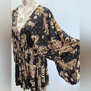 Light and flowy black and tan print Arzel mini dress from Free People, size M, features a drawstring waist, tie at neck and balloon sleeves.