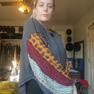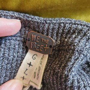 FREE PEOPLE We The Free Blossom Thermal Boho Patchwork Sleeves Top. Heathered charcoal gray waffle weave thermal fabric on the body of the top. Wide boat neckline. Dolman sleeves are a patchwork of mixed woven rayon fabrics, and they are loose and balloon-like with elastic sleeve hems. Oversized fit. Unfinished round hem, slouchy oversized style. Excellent condition.