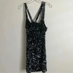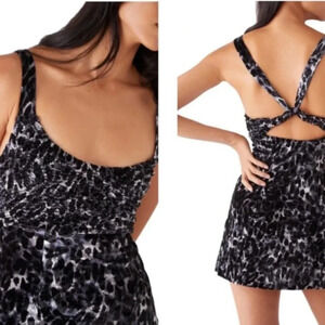 Stunning velvet mini slip featuring an allover cheetah leopard print design with a textured bodice and strappy back details. A-line silhouette. Open back detail. Scoop neckline. 94% polyester 6% elastane. Size medium. Great preloved condition