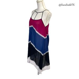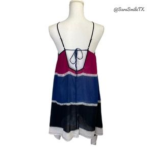 FREE PEOPLE boho color block hi lo dress with asymmetrical hem. Magenta pink, blue, black & white color blocks. Straps across chest & straps tie at back. Low, open back. A-line swing fit. Lightweight, very slightly sheer gauzy fabric. Spaghetti straps. Excellent used condition. No other holes or stains. Missing tags. Fabric: cotton/rayon blend. Measurements: 21” bust, 34” shorter length, 43” long length. Size Small. Retail $168.