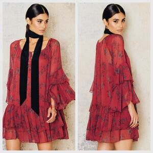 FREE PEOPLE Boho Tiered Floral Mini Red Dress / Tunic Blouse Top