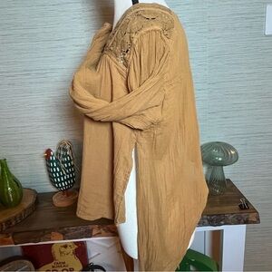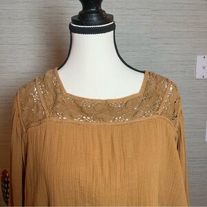 FREE PEOPLE Brown Tie Waist Lace Top Women’s Size XL Boho Crochet Cotton