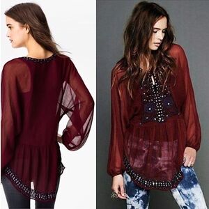 FREE PEOPLE Burgundy Crinkle Sheer Embroidered Beaded Long Sleeve Boho Tunic S