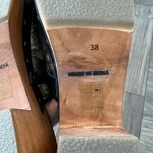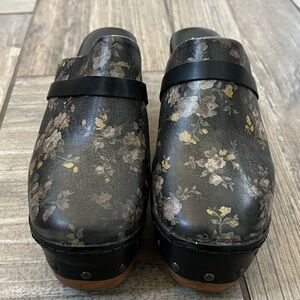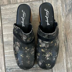 FREE PEOPLE Calabasa Womens Clog size 38 (8). Like new condition. Black Floral Leather. Rivets with an aged finish and a wooden heel lend a classic look to this versatile clog set on a rubber sole.