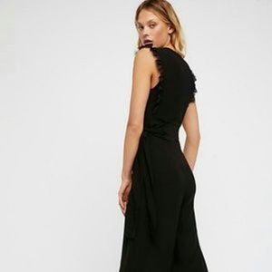Lightweight CEM Free People jumpsuit pieced with delicate eyelash lace trim and pleat detailing.