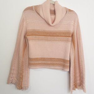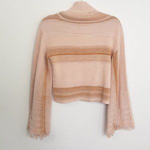 Retro-inspired stripes enliven this cozy turtleneck cut in a cropped silhouette with fringe-trimmed bell sleeves.