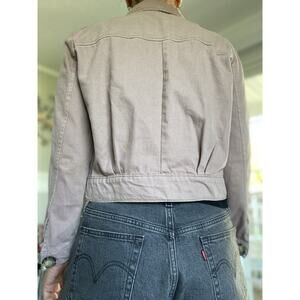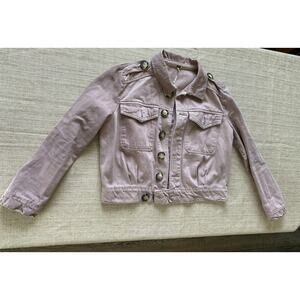 From boho brand Free People, the slouchy-style Eisenhower jacket features a mauve purple cotton denim fabric, oversized tortoise button, long sleeves and hip length.