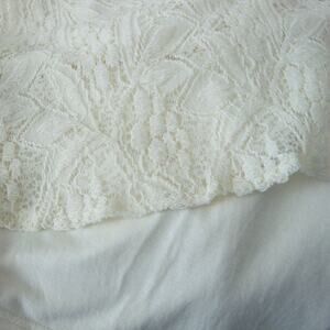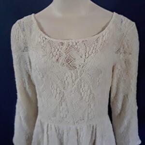 Free People Lace Overlay Babydoll Dress, Fully Lined, Sweetheart Neckline and 3/4 Length Sleeves. Gorgeous romantic creamy vanilla off-white dress has soft, stretchy lace overlay and soft jersey lining (bodice, skirt and part of the sleeves). The front and back have soft gathers and a wide, flouncy skirt. Perfect dress for a destination wedding, evening out or dressy event. Tag Size: Small. Chest 33". Excellent Condition. No Sign of Wear. Smoke Free Home.
