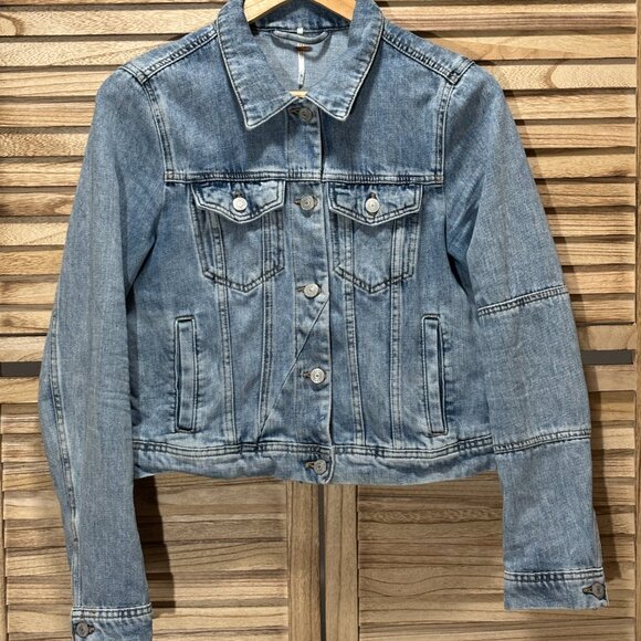 Free People Rumors Denim Jacket. Super Soft! Color is indigo like acid wash from the 90's. Urban cowboy, boho chic. The classic, slightly cropped, relaxed fit. Barely worn, like new condition. Size Small. Breast flap pockets and hidden side pockets. No visible wear and tear. 90% cotton, 10% polyester.