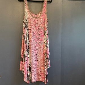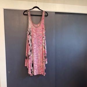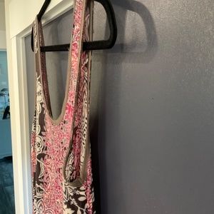 Free people size small bilevel NWOT. Never worn. Brown,cream,magenta soft bold colors. Wide arm holes. Dress back measures 36 in long from the front neckline . The front of the dress measures 27 inches from the front scoop neckline. Back of the dress is a lower scoop . Shows of your back. Stressed finished look.