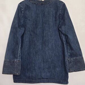 Stylish denim deep V-neck with long sleeves and wide bell opening.