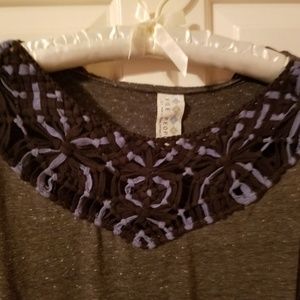 Free People grey dress, slightly over the knee with an angle drop, beautiful black and violet embroidered neck line.