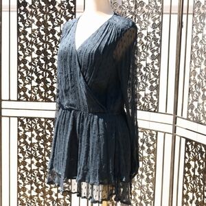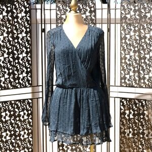 100% rayon. Hand wash cold. Fully lined. Surplice neckline. Elasticized waist. Solid color, casual textured mini dressAllover textured dotsWrap styling draped in front with layered hemLong sheer sleeves with ties at cuffs.