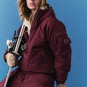 Retro cool meets snow-day chill in this pullover, featuring a water-resistant fabrication and light insulation with a flattering, adjustable fit. **Fit:** Pullover style; relaxed silhouette; water-resistant fabrication; adjustable bungee bottom seam and drawstring hood **Features:** Water-resistant fabrication and waterproof zippered pockets; PrimaLoft insulation; adjustable hood and bottom hem; ribbed detail sleeve cuffs; elasticated snow skirt; internal goggle and phone pockets, external pass stash pocket **Why We ❤ It:** This pullover keeps you effortlessly warm with novelty charm