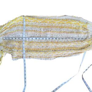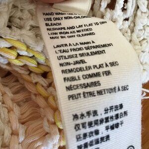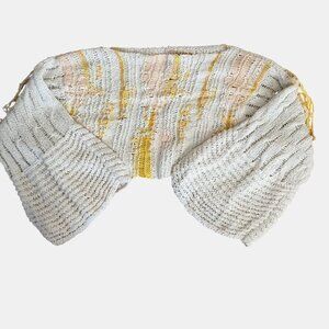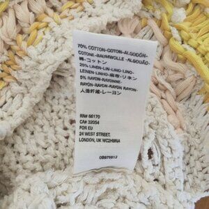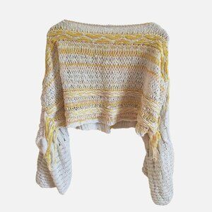Cream + yellow multi open-knit, relaxed fit, and dramatic bell sleeves. Perfect for layering over tanks, dresses, or high-waisted denim.