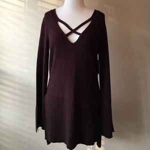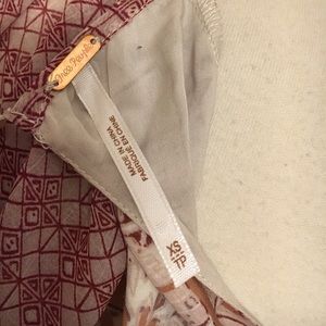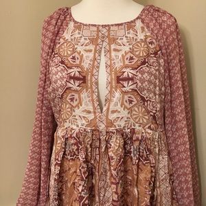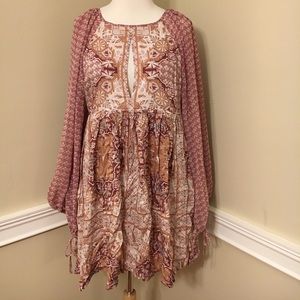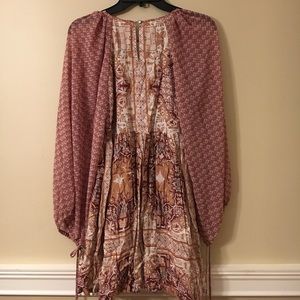 GORGEOUS Free People Blush/Rust/White Patterned Flowy Dress. Long sheer sleeves with ties at the wrist, side zipper, and flirty chest cutout. Super cute bohemian style dress - gently worn/in perfect condition.