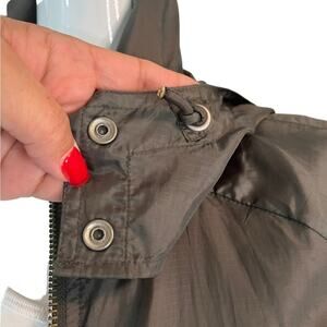 This is a green/olive lightweight jacket with an attached hood to it. It’s in excellent used condition and gently loved.