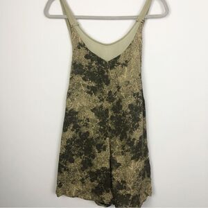 Adorable trendy romper by Free People. Dark green with black abstract floral print. Shorts. Suspender style back straps. Trim at the top and straps is semi sheer. Exposed metal back zipper closure. There’s a small mark of discoloration on the sheer as shown. Otherwise great preowned condition. Womens size extra small (XSmall).