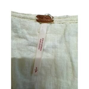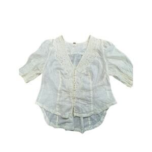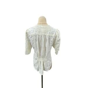 This product is a Free People embroidered top with runched detail and elastic back, featuring puff sleeves and a V-neckline. Made of 100% cotton in a cream color, it has a relaxed fit and is machine washable. The top has a bohemian style, perfect for the summer, fall, and spring seasons. The button-up closure adds a touch of vintage charm, making it a great addition to any woman's wardrobe. 22" top to bottom x 14" shoulder to shoulder x 17" pit to pit.