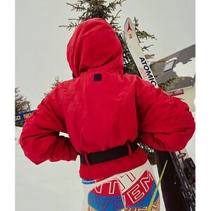 * The perfect blend of cool and classic, this super cool ski jacket is featured in a slightly cropped, slouchy silhouette, hood detail, and exaggerated sleeves with ruching at seams for an added touch of dimension.