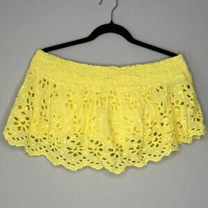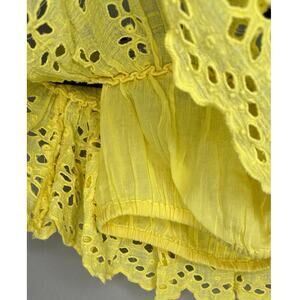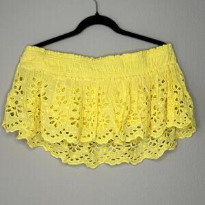 Free People FP One soft and lightweight cotton gauze crop top in an off the shoulder design. All over floral cut out embroidered design with a scalloped edge trim. Underneath is a elastic banded liner so nothing shows when you raise your arms!