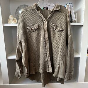 Add the perfect touch to any look with this forever timeless, button-front jacket featured in a stunningly subtle tie dye print and waffle knit fabrication for added texture. Button-front closure. Slouchy, relaxed fit. Classic collar detail. Double bust patch pockets. 100% Cotton. Size small. Great preloved condition