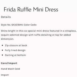 DETAIL: STRAPLESS RUFFLE AT BUST. INVISIBLE ZIPPER DOWN BACK. LINED. INNER GRIP TAPE.
