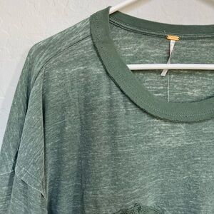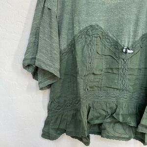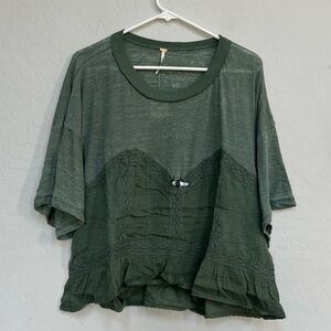 FREE PEOPLE Fall in Love Lace Inset T-Shirt size large. New with tags. Washed Army color. This floaty slubbed T-shirt charms with lace insets creating an illusion sweetheart neck and a ruffly peplum.