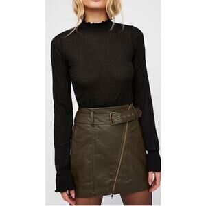 Dark olive faux leather mini skirt with full lining. Features an A-line cut, moto-style, decorative buckled belt, and a diagonal front zip closure.