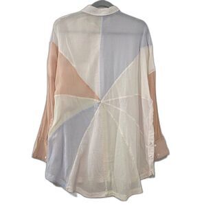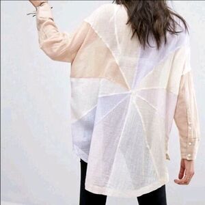 Soft pink, powder blue, beige & white gauzey cotton form a gorgeous pinwheel on this amazing Free People oversize button up shirt. Perfection for your beach vacation, soft looks, resort stays and warm weather beauty!
