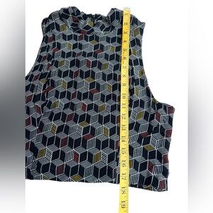 All-over geometric print. Mock neck. Smocked back panel for comfort. Exposed back zipper with ring pull. Dress up or dress down! The top is in great condition with no flaws.