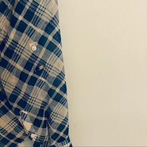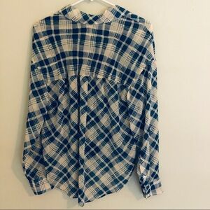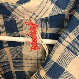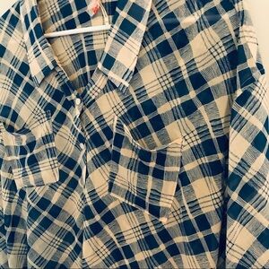 Free People Plaid Blue gingham sheer button down shirt. Unlined, button down front, convertible sleeves, pleated center back, two front pockets and high low style loose fitting shirt.