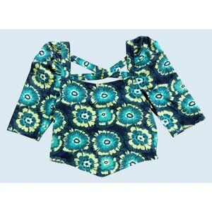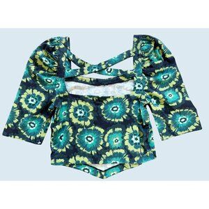Great top by Free People. Brand new with tags! Green printed crop top. Criss Cross back detail. Kerchief front. Square neck. Lightly puffed shoulders. 97% cotton / 3% elastane. Size small.