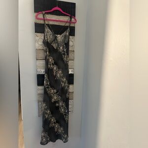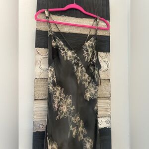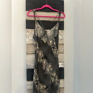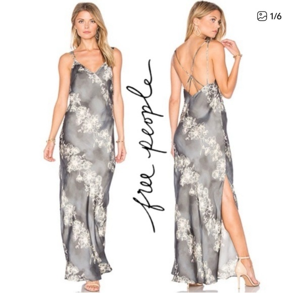 Chic back design with delicate floral patterns. Perfect for elegant occasions. Flowy silhouette with a stylish slit.