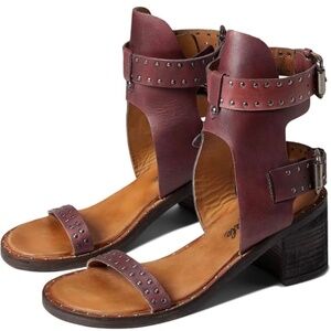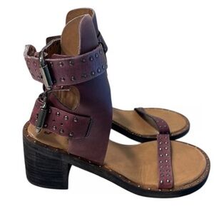 Free People Happiness Heeled Sandal - Sz 39 in distressed burgundy soft leather with studded details. Darling Gladiator-type sandals with a classic round toe, perfect with a sundress for a walk in the park or a night out on the town