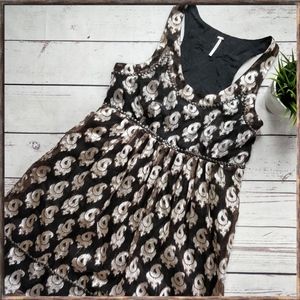 This is a beautiful Free People "Holiday Party" dress in size 8. Silver foil print, metal discs. Zipper. Lined. In great, gently used condition; minor pulls. Approximate measurements: 17 1/2" across chest, 15 1/2" across waist and 35" in length.