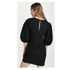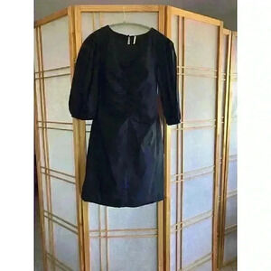 This is a Free People Scoop neck Black Mini dress with Mid-Length puff sleeves with elastic cuffs. There is a ruching detail down the front middle of the dress, and a button keyhole and hidden zipper in the back of the dress. And this dress is fully lined (picture provided). Not too polished, not too casual, this dress is great with flats, sneakers or sandals. This dress is in excellent condition.