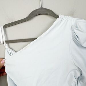 Elevate your style with this chic one-shoulder bodysuit in a soft light blue called Crisp Morning by Intimately for Free People. Snap crotch and thong back. One puff sleeve. Brand NWT but has some make up marks from try on as shown. Women’s size small.