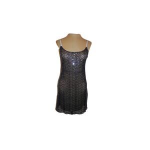 semi-sheer mini dress featuring all-over sequin embellishments and spaghetti straps. It is part of the Intimately collection by Free People. The style is a black sequin cami slip dress. The dress has a scoop neck and is often described as being suitable for clubwear.