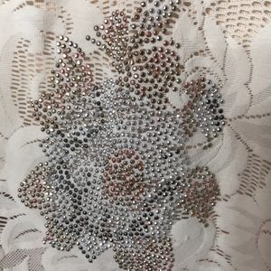 Romantic...cream lace with a cluster of five gold/silver/rose gold floral blossoms on the front hemline. Makes for a beautiful layering piece with a cardigan/blazer lots of layering options with this tank!