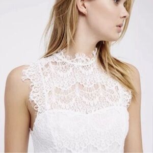 This stunning white sheath dress by Free People features a sleeveless design perfect for bridal occasions. Crafted from delicate lace, it showcases intricate patterns and a captivating backless style, making it an elegant choice for any wedding event.