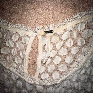 Romantic and feminine, this Free People ivory lace peplum tank top is a perfect addition to your wardrobe. Features an intricate lace design with a textured polka-dot pattern on the bodice, a flared peplum hem, and a keyhole button closure at the back. Lightweight and breathable, it’s ideal for layering or wearing on its own. This top exudes boho-chic vibes, making it a versatile piece for casual outings or dressed-up occasions.