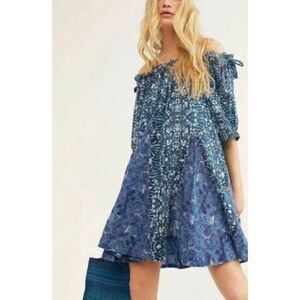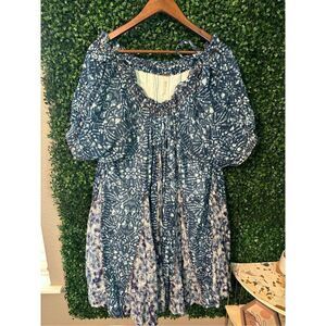 FREE PEOPLE JET SET MINI DRESS MIXED PRINTED TUNIC Oversized DRESS Blue sz small