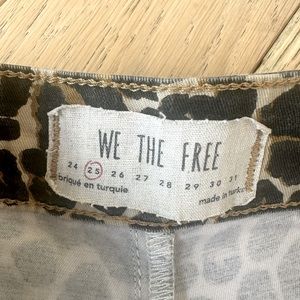 Super cute FREE PEOPLE leopard jeans. Size 25. I’ve gotten so many compliments on these. They are light weights and easy and comfortable to wear. They have a zipper and button closure with no pockets. Dress them up with heels or down with sneakers. Slightly faded, this is reflected in the price.
