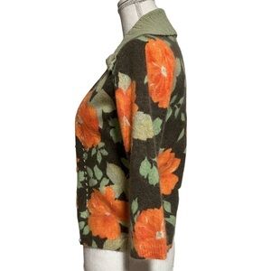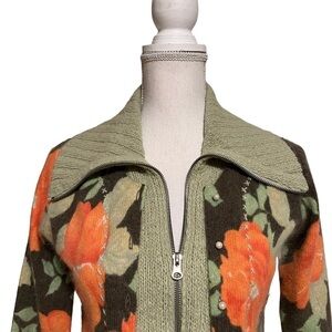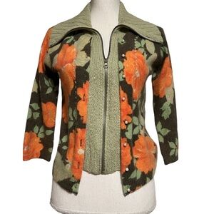 Womens pretty zippered sweater with greens and orange in a floral pattern