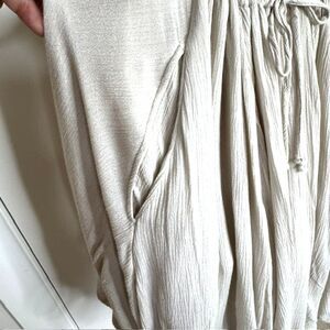 Gauzy open back halter dress (color Stone I think), featuring 4 adjustable tie straps 1 behind the neck, 2 across the bodice and 1 at the waist, adjustable fit, layered mini dress. Textured fabric made of hand washable 100% Rayon. In excellent condition. (The beads are different than the cover photo, the beads are a beachy teal green-ish, see my photos)