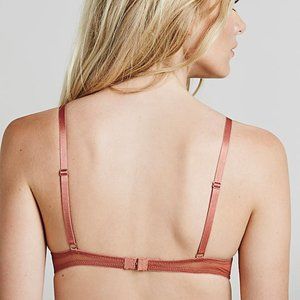 Free People lace triangle bra with a half wire. A half wire is thinner than a normal underwire and gives the same support as a more constructed bra, but with the comfortable aesthetic of a soft bra. It comes with adjustable shoulder straps and clasp closure in the back. A triple threat of delicate, sexy, and sweet all at once.