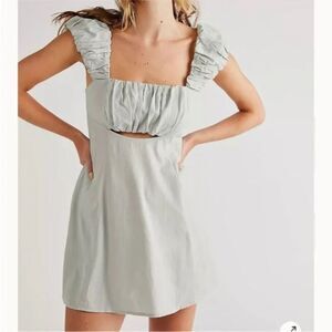 FREE PEOPLE Light Green Bom Bom Island Ruched Linen Cotton Boho Mini Dress Large