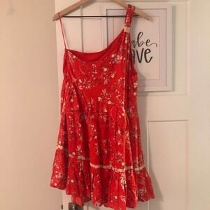 FREE PEOPLE Linen All Mine One Shoulder Red Floral Mini Dress Size Medium NWOT